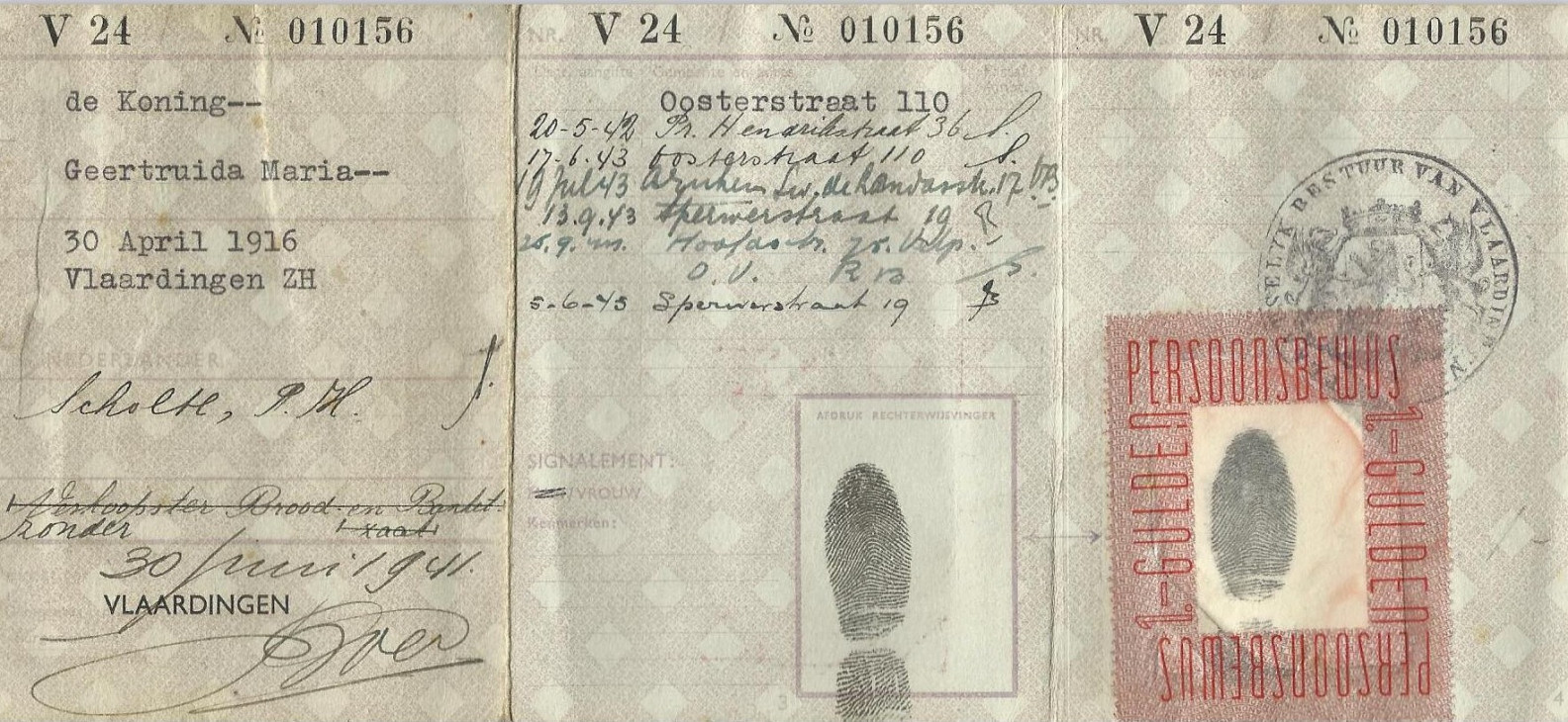 Het identiteitsbewijs van Truus waar o.a. op te zien is waar zij woonachtig is geweest.