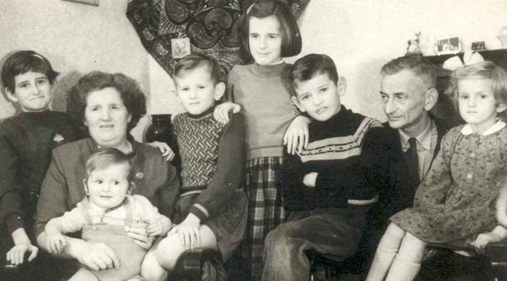 Foto gemaakt in 1956. Soms kwam er een fotograaf aan huis er werd er een mooie familiefoto gemaakt. Vlnr: Hannie, moeder Truus, Antoon, Theo, Cocky, Bennie, vader Piet en Tineke.